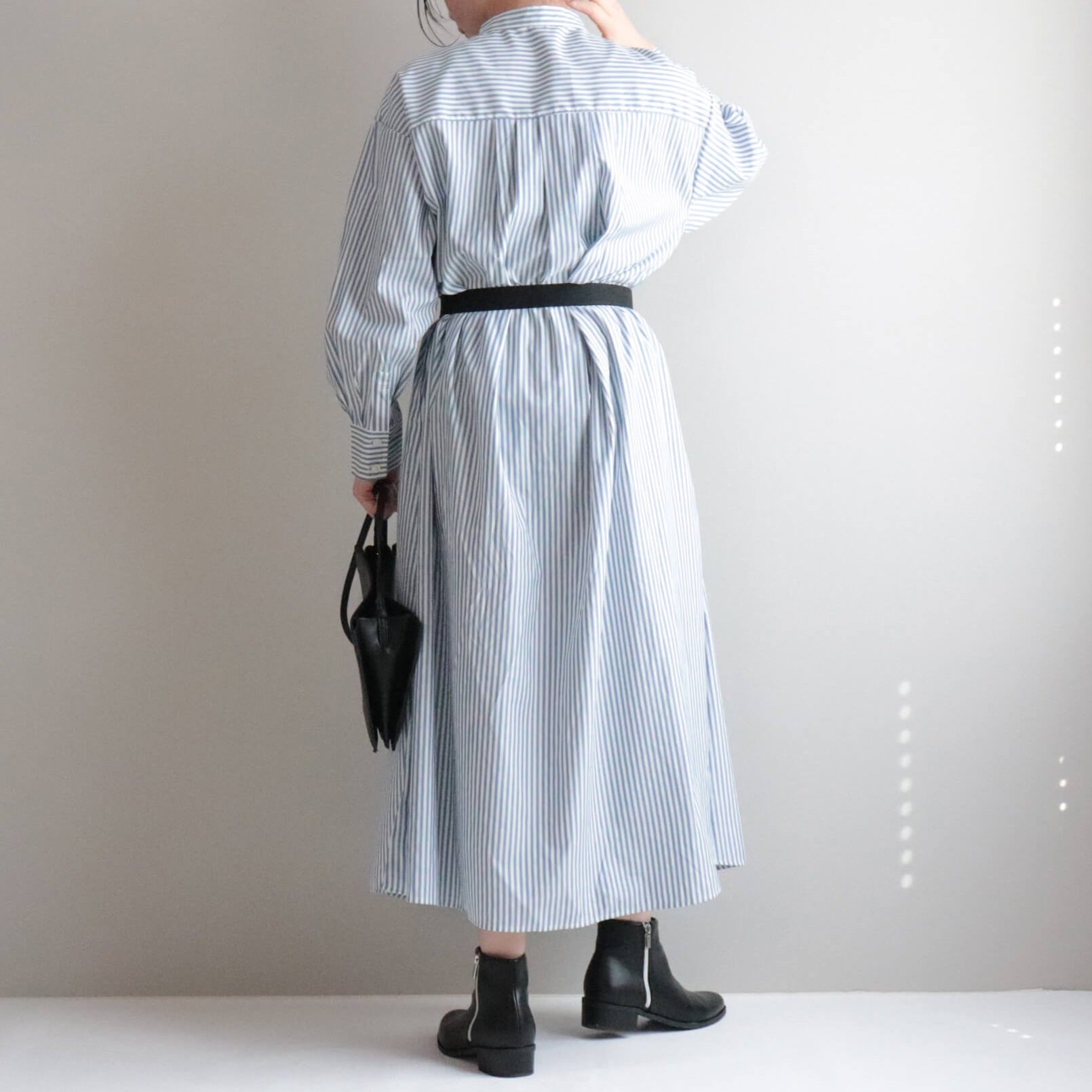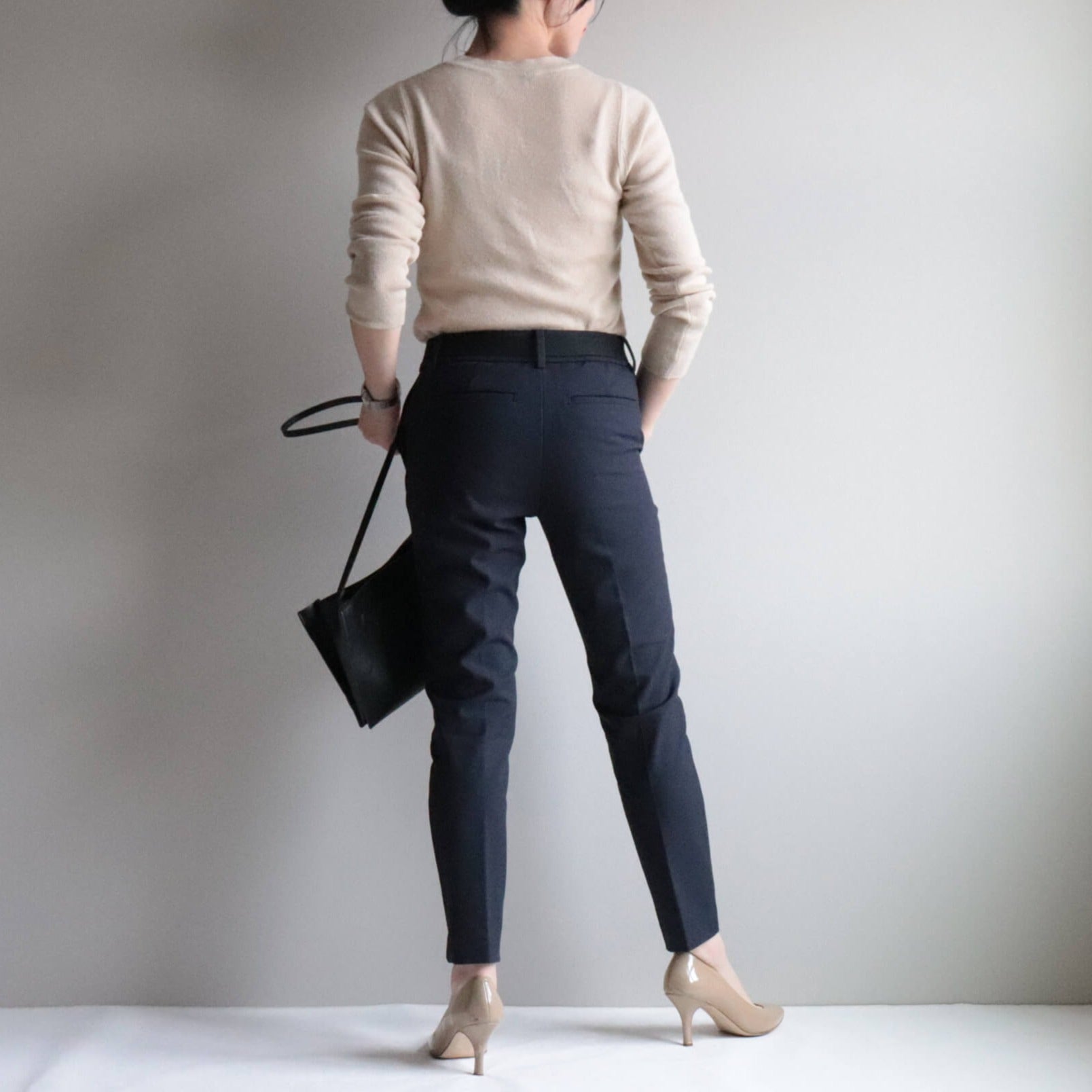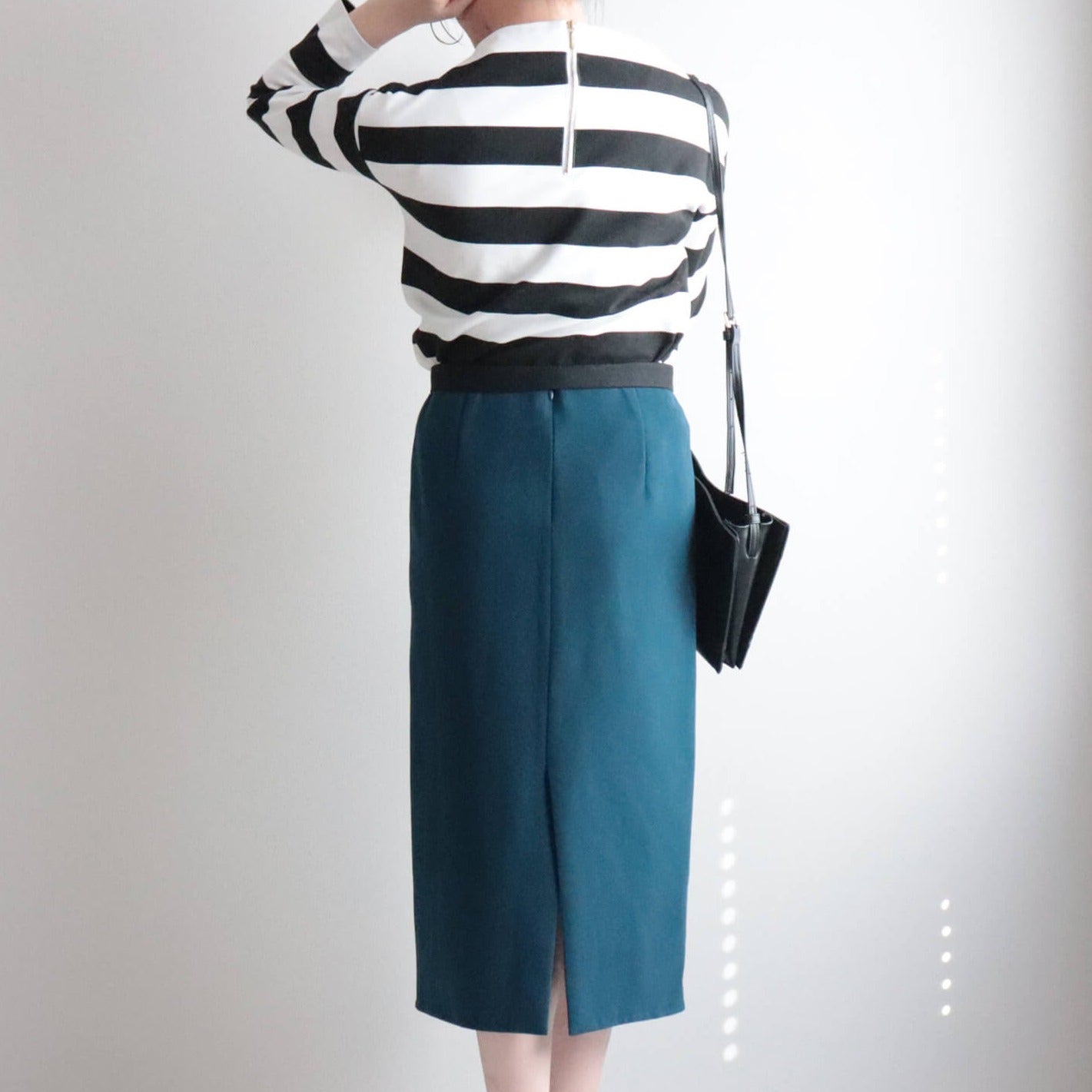 伸縮性のあるゴム生地がフィットして屈んでも背中が開かず安心。