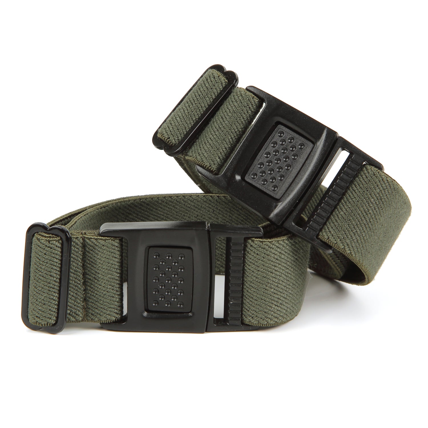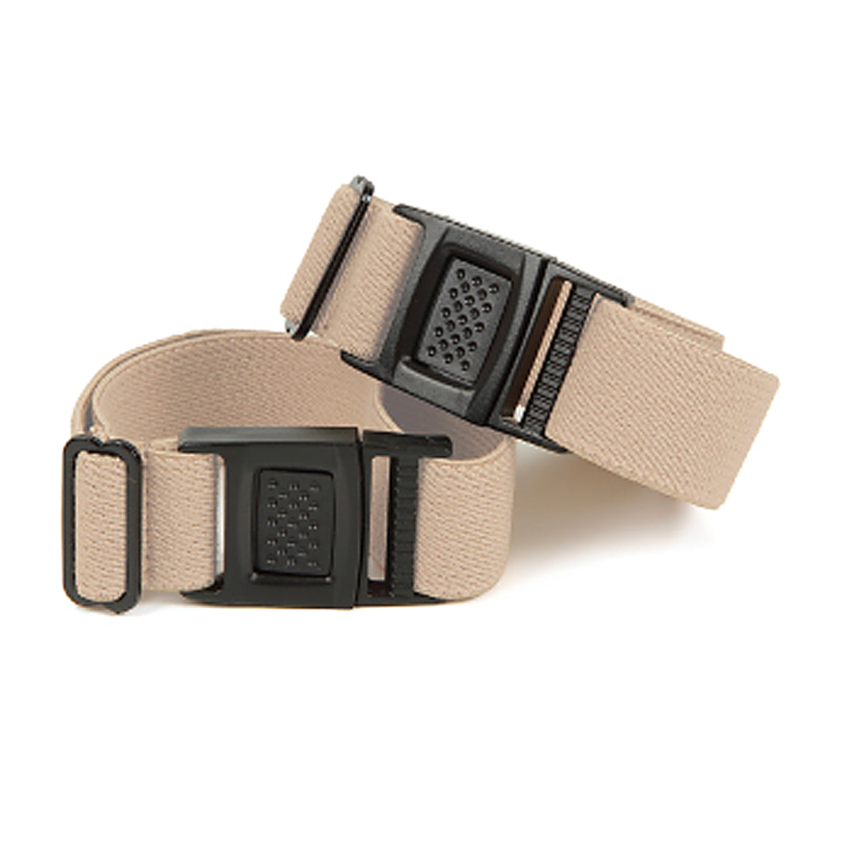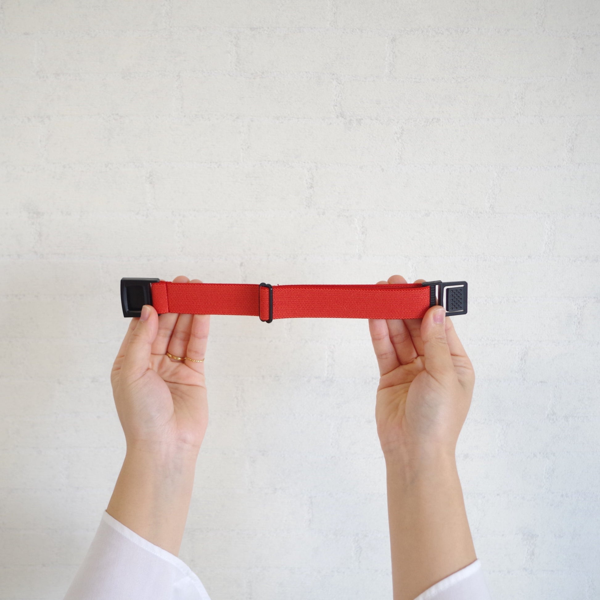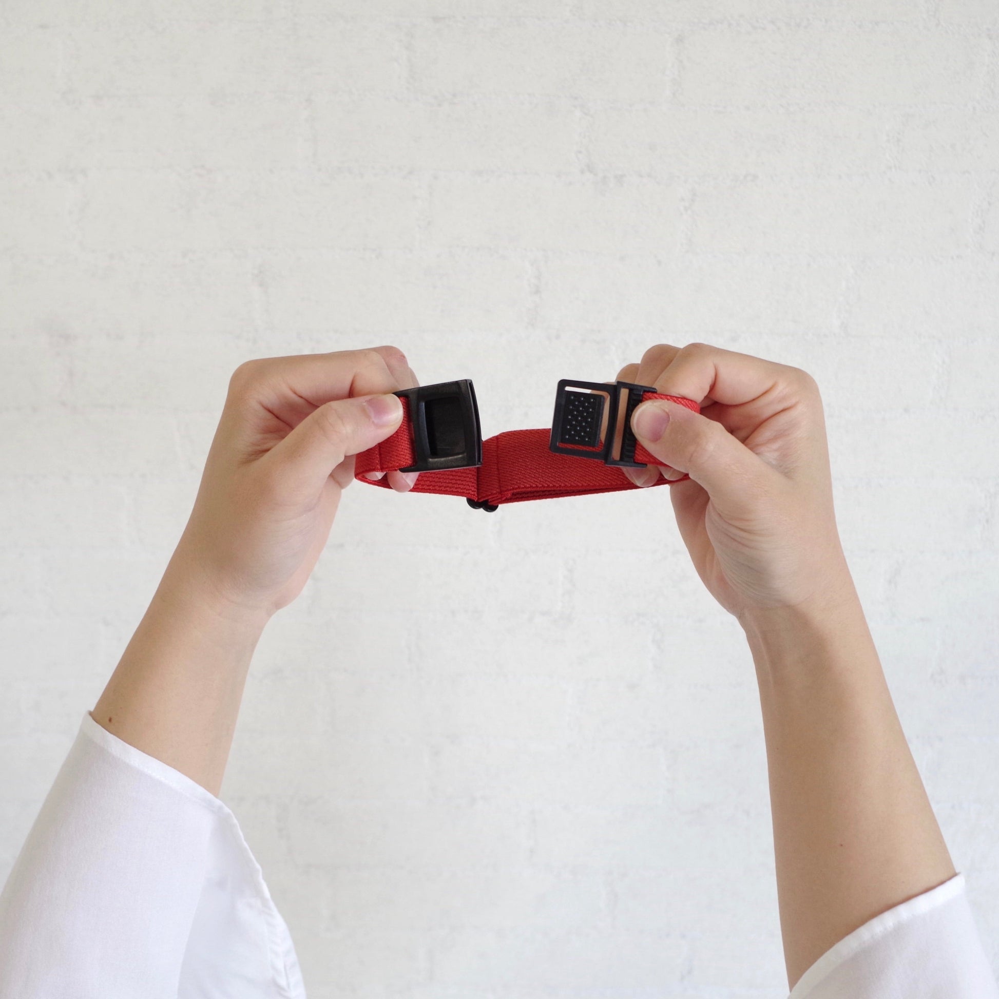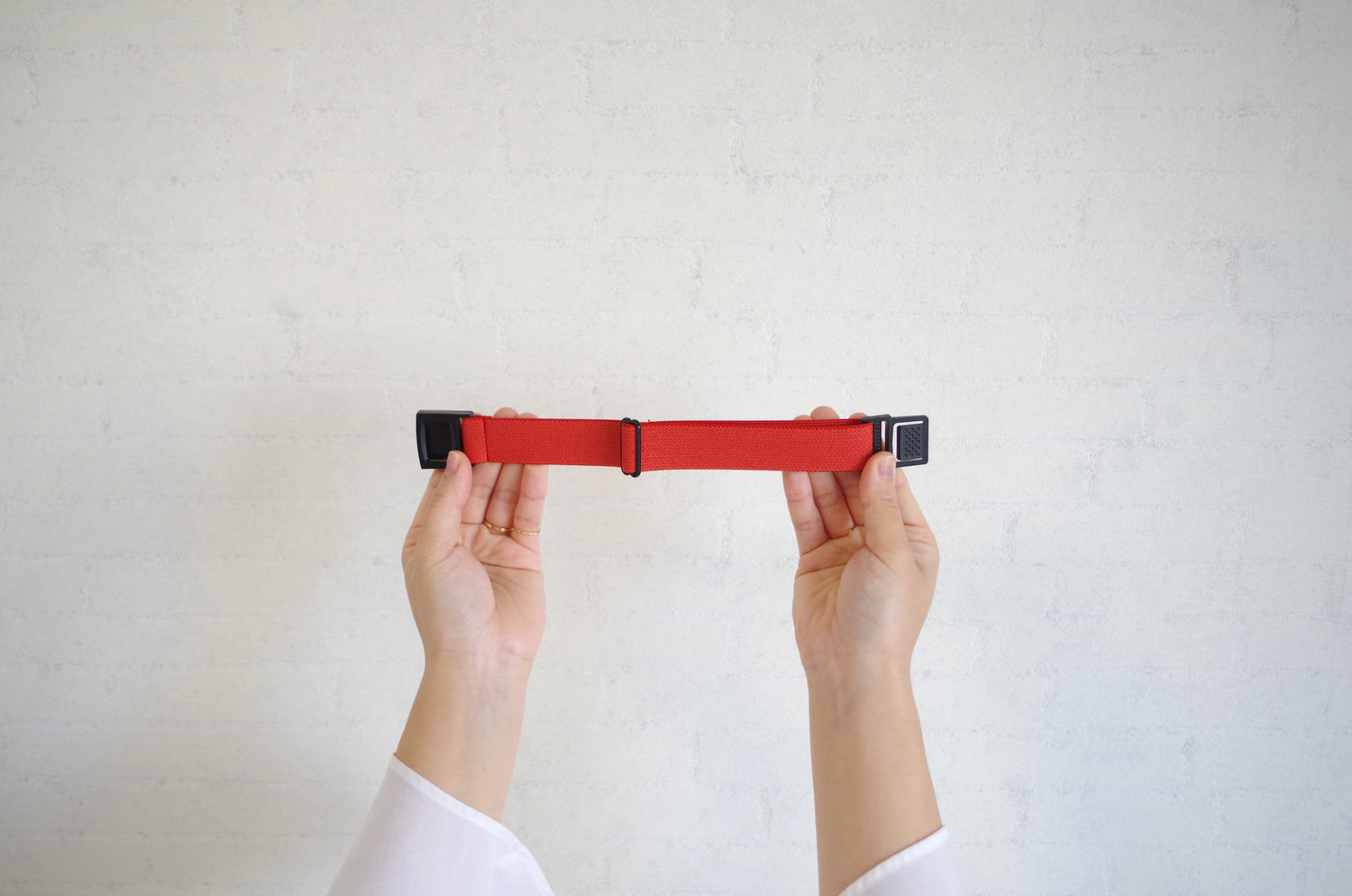 伸縮性のあるゴム生地にワンタッチで着脱ができるプラスチックバックルを採用。
