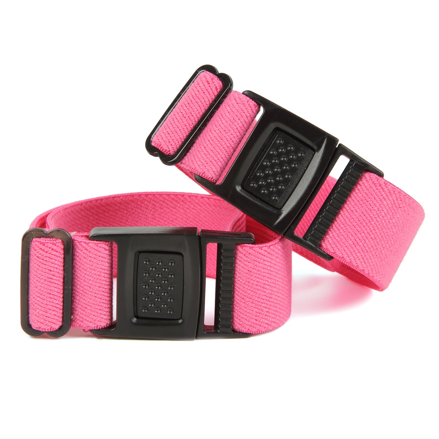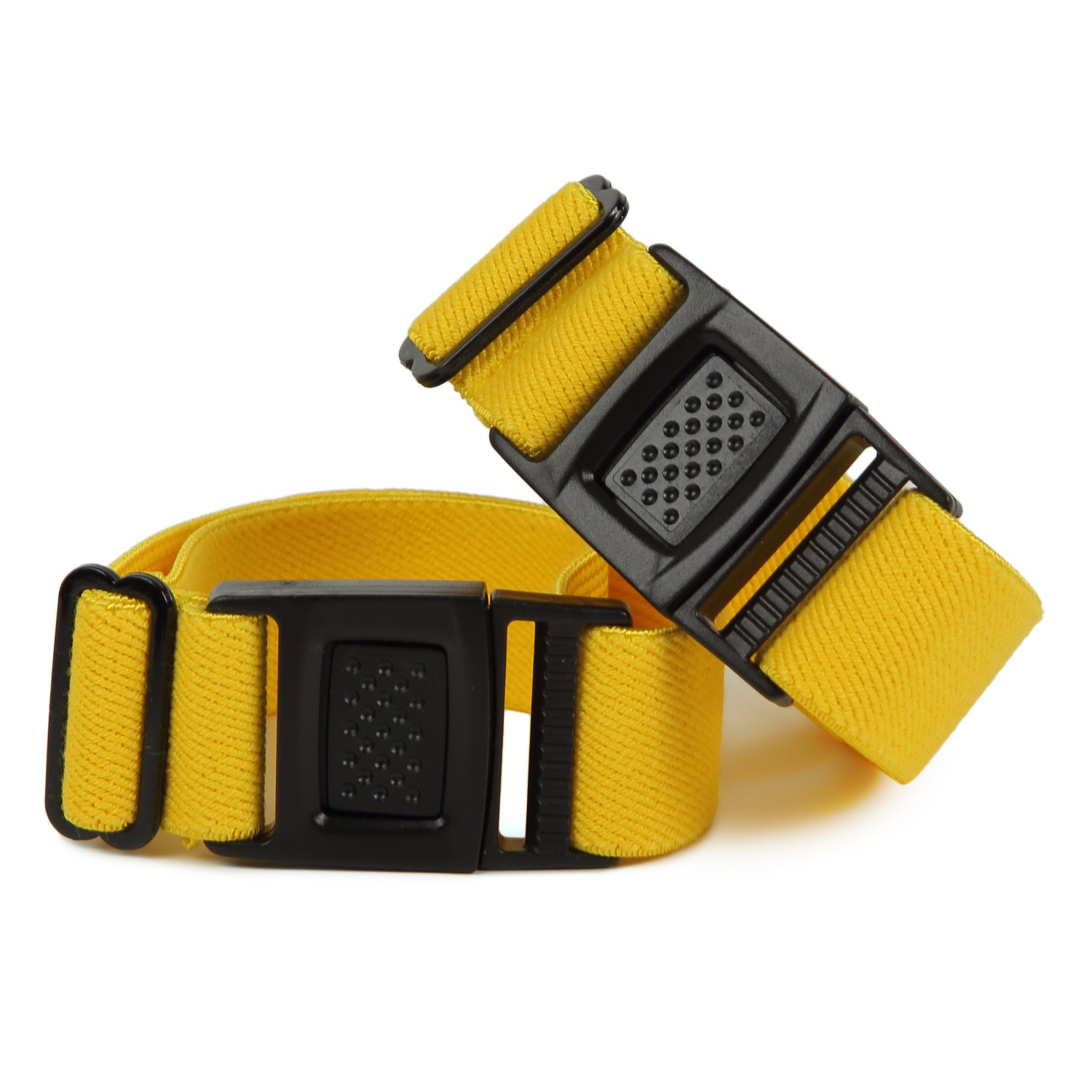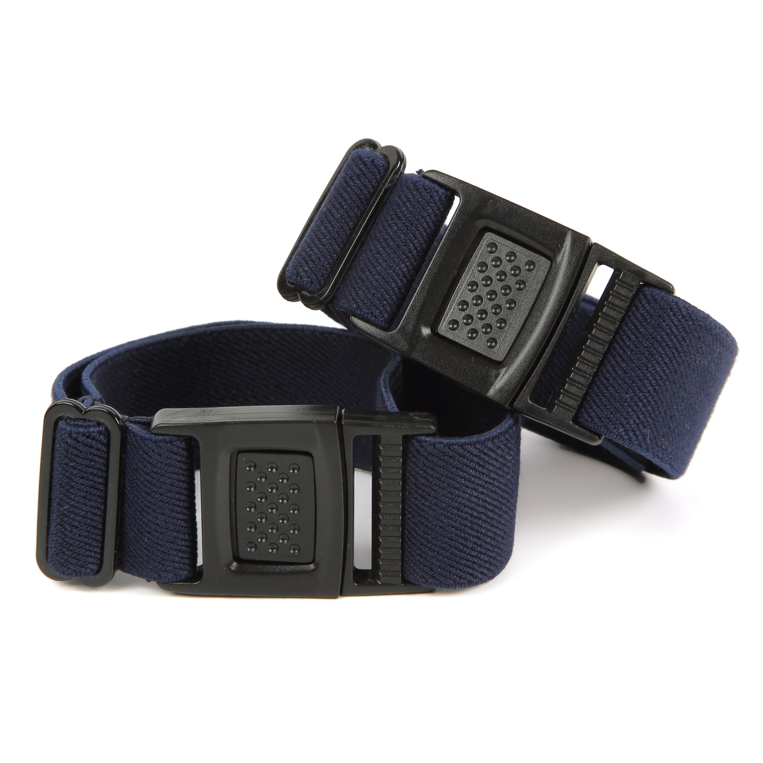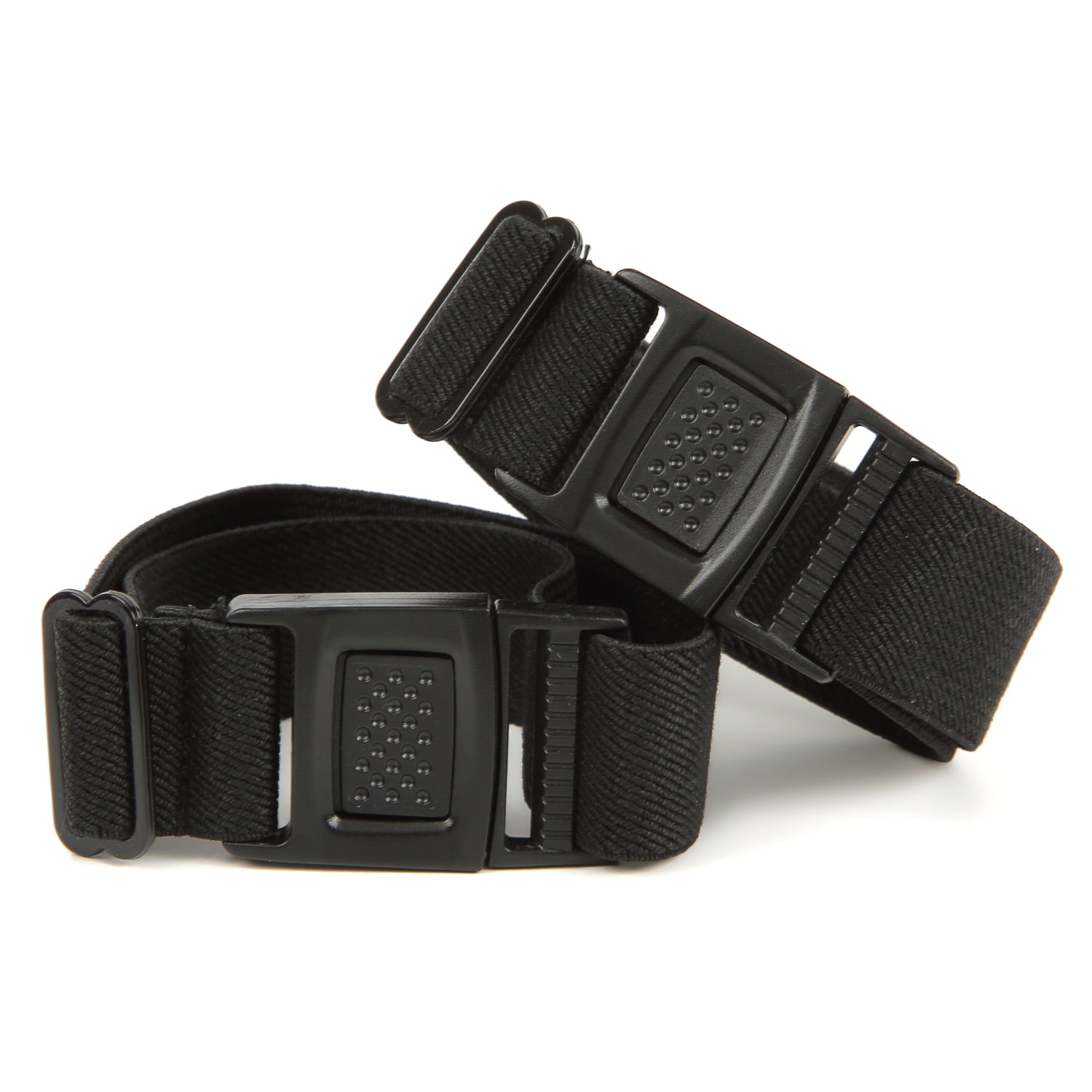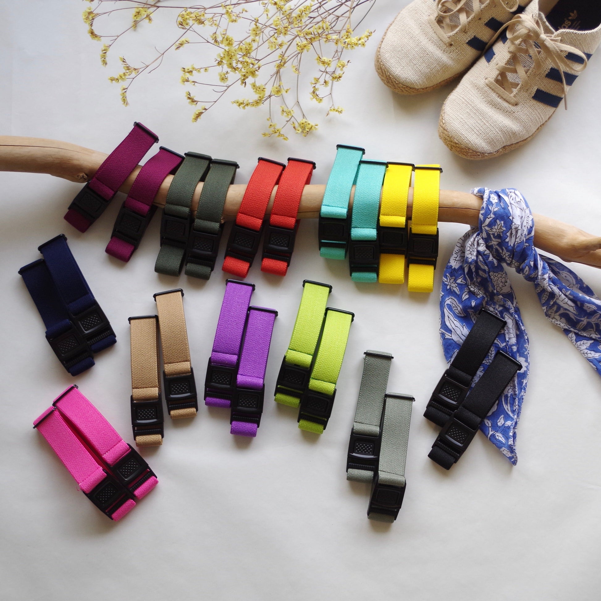 伸縮性のあるゴム生地にワンタッチで着脱ができるプラスチックバックルを採用。